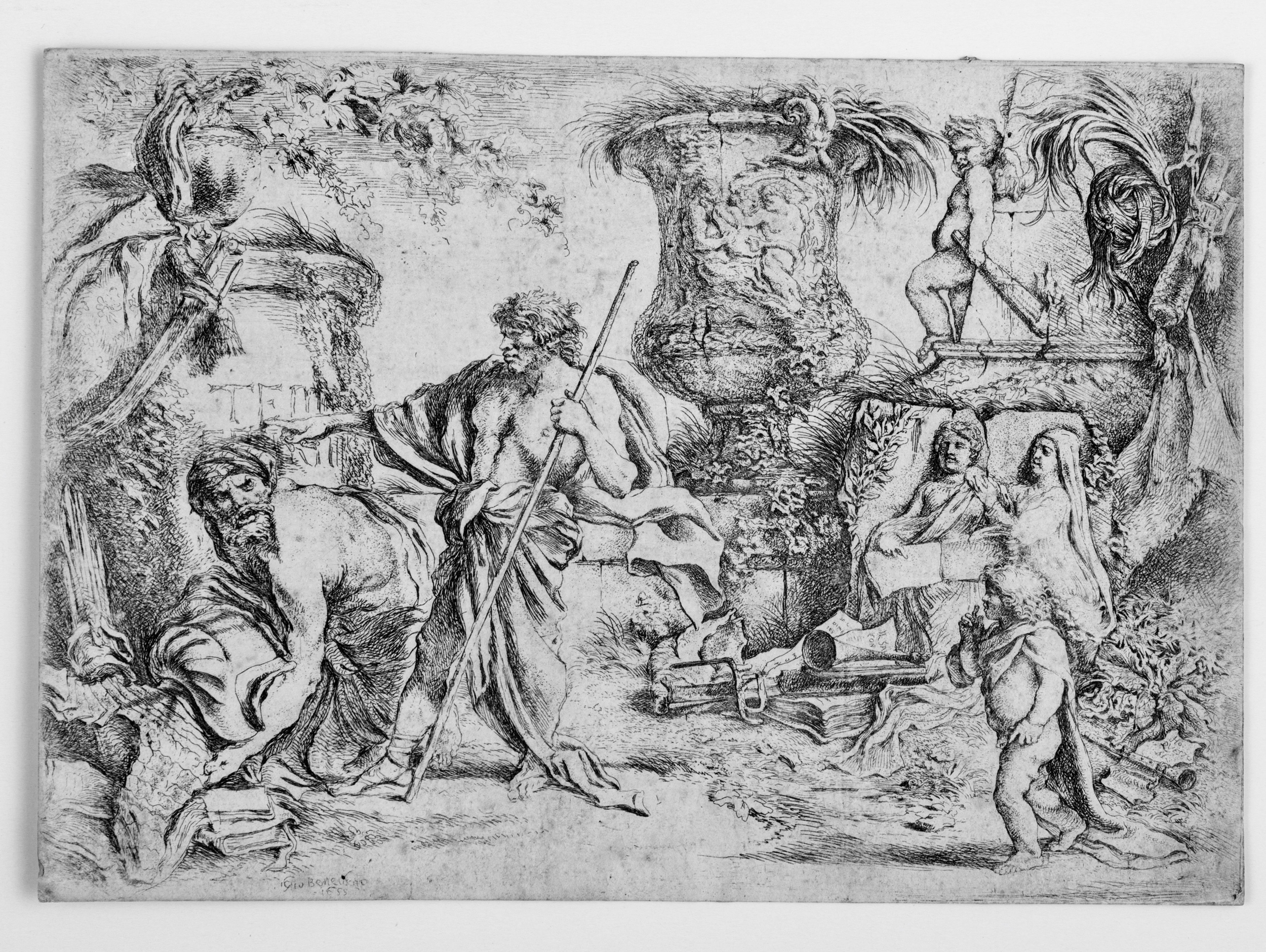 Giovanni Benedetto CASTIGLIONE (Genova, 1609 - Mantova,1664) TEMPORALIS AETERNITAS (Allegoria della transitorietà) Firmato Gio Benedetto e datato 1655 in basso a sinistra (primo o secondo stato da studiare) Acquaforte su carta 182 x 261 mm Provenienza: Genova, Giovanni Grasso Genova, collezione privata